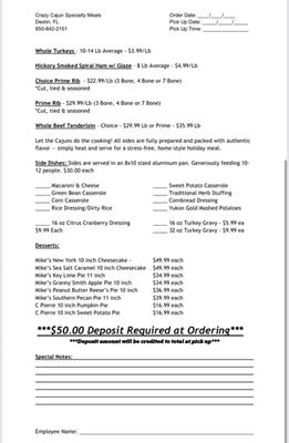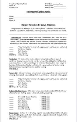 Hi! It's getting close to Thanksgiving and we are still taking orders! Let us help you with your families Thanksgiving Dinner!!!! Turduckens, Turducken Rolls, Turkey Rolls, Deboned Stuffed Turkeys, Sides, Desserts & More!!!!